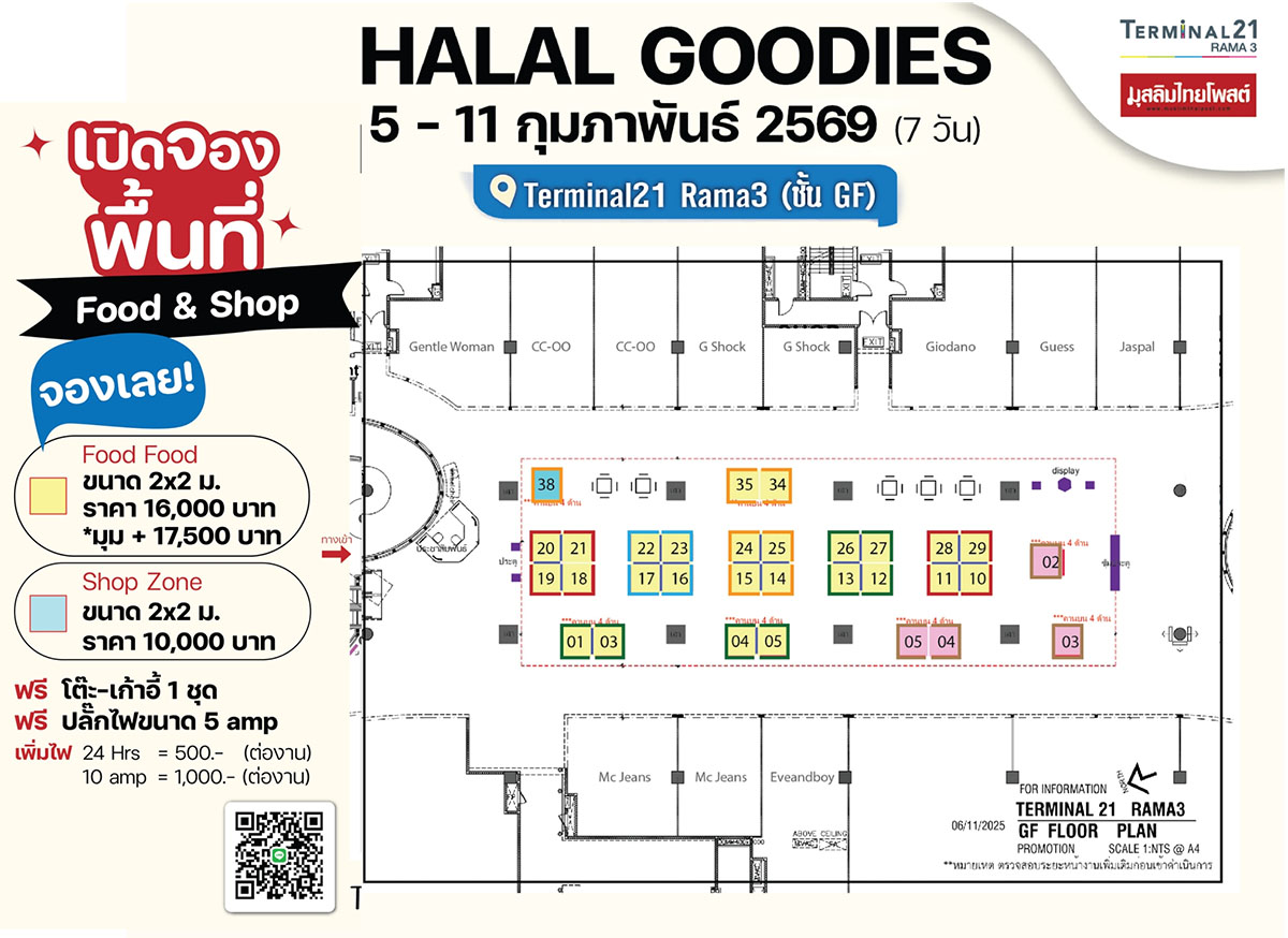 “Halal Goodies : Spice Odyssey” ระหว่างวันที่ 5 - 11 กุมภาพันธ์ 2569 ณ บริเวณลานกิจกรรม ชั้น G ศูนย์การค้า เทอร์มินอล21 พระราม3 กรุงเทพมหานครฯ งานรวมอาหารฮาลาลคุณภาพ ที่คัดสรรเมนูเด็ดจากร้านฮาลาลชื่อดังมาไว้ในที่เดียว ภายใต้แนวคิดการเดินทางผ่านเครื่องเทศและรสชาติจากหลากหลายวัฒนธรรม