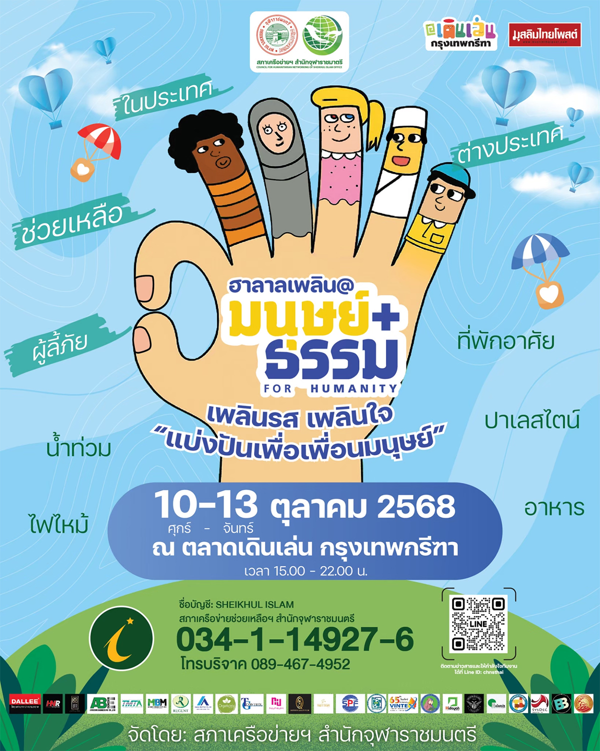 “เพลินรส เพลินใจ แบ่งปันเพื่อเพื่อนมนุษย์” เพื่อช่วยเหลือด้านมนุษยธรรม และสนับสนุนโครงการต่าง ๆ ของสภาเครือข่ายฯ ภายในงานพบกับกิจกรรมต่างๆ HUMANITY TALK เปิดใจผู้ลี้ภัยกับการช่วยเหลือของสภาเครือข่ายช่วยเหลือด้านมนุษยธรรม สำนักจุฬาราชมนตรี